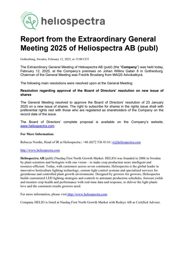 The Extraordinary General Meeting of Heliospectra AB (publ) (the “Company”) was held today, February 12, 2025, at the Company’s premises on Johan Willins Gatan 8 in Gothenburg. Chairman of the General Meeting was Fredrik Brusberg from MAQS Advokatbyrå.
