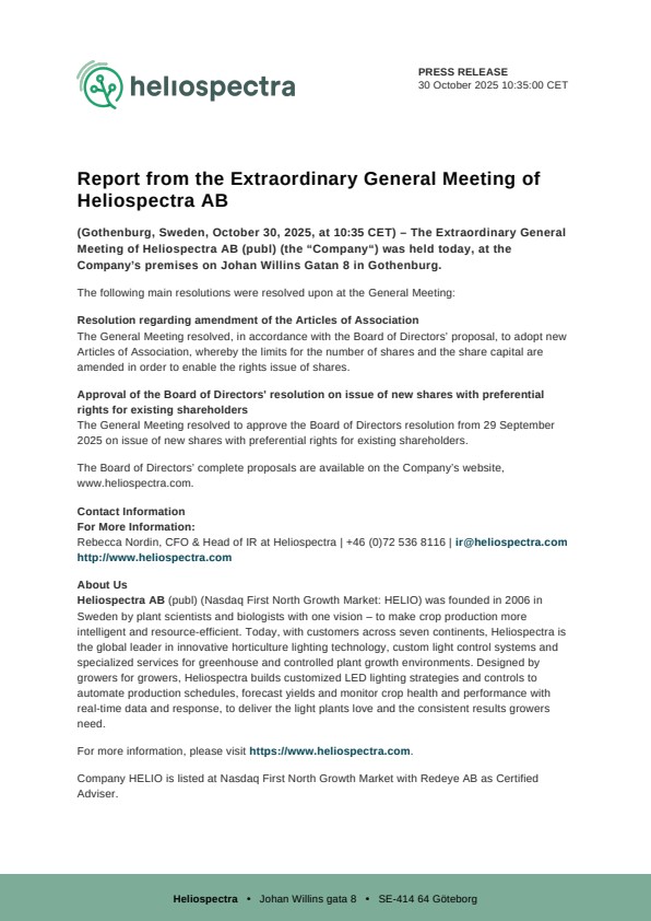 (Gothenburg, Sweden, October 30, 2025, at 10:35 CET) – The Extraordinary General Meeting of Heliospectra AB (publ) (the “Company“) was held today, at the Company’s premises on Johan Willins Gatan 8 in Gothenburg.