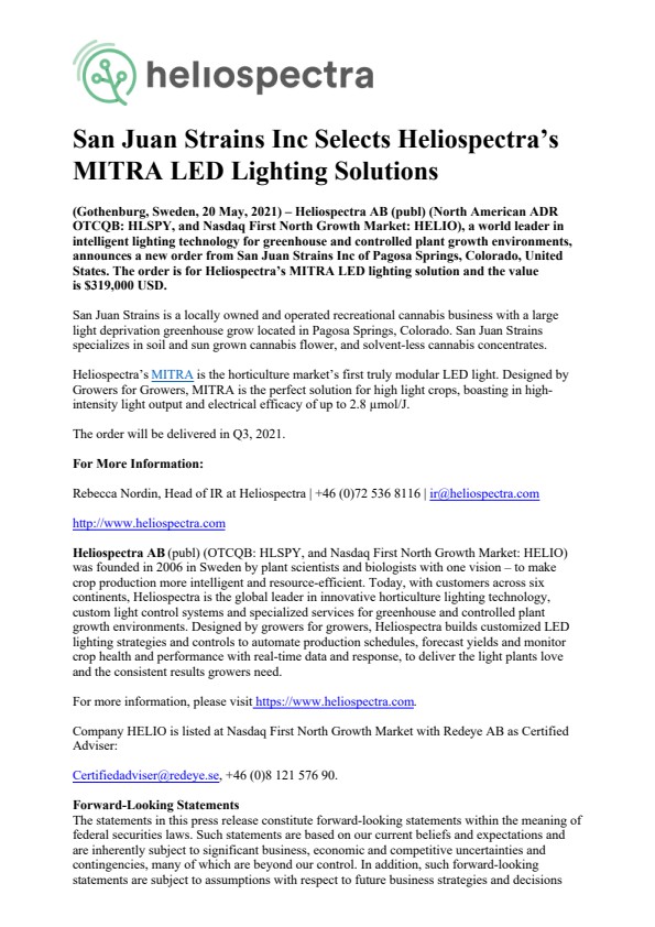 (Gothenburg, Sweden, 20 May, 2021) – Heliospectra AB (publ) (North American ADR OTCQB: HLSPY, and Nasdaq First North Growth Market: HELIO), a world leader in intelligent lighting technology for greenhouse and controlled plant growth environments, announces a new order from San Juan Strains Inc of Pagosa Springs, Colorado, United States. The order is for Heliospectra’s MITRA LED lighting solution and the value is $319,000 USD.