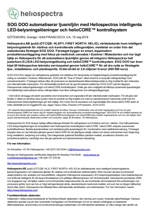 Heliospectra AB (publ) (OTCQB: HLSPY, FIRST NORTH: HELIO), världsledande inom intelligent belysningsteknik för växthus och kontrollerade odlingsmiljöer, meddelar en order från det makedonska företaget SOG DOO. Företaget bygger en smart, toppmodern produktionsanläggning med fokus på medicinsk cannabis i Gostivar i Makedonien och har tagit hjälp av Heliospectra för att automatisera ljusmiljön genom att integrera Heliospectras helt justerbara ELIXIA LED-belysningslösning och helioCORE™ kontrollsystem. SOG DOO har även köpt till Heliospectras tekniska servicepaket genom helioCARE™ för att dra nytta av företagets ljus-, installations- och plantexpertis. Ordervärdet är 2,8 miljoner kronor (260 000 euro).
