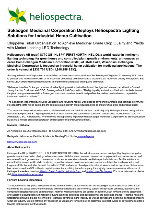 Heliospectra AB (publ) (OTCQB: HLSPY, FIRSTNORTH: HELIO), a world leader in intelligent lighting technology for greenhouse and controlled plant growth environments, announces an order from Sokaogon Medicinal Corporation (SMC) of  Mole Lake, Wisconsin. Sokaogon Medicinal Corporation is focused on industrial hemp cultivation for medicinal applications. The order is valued at $232,704 USD (1,948,186 SEK).