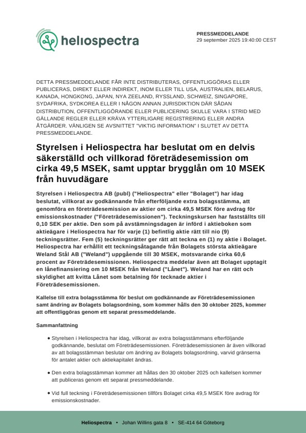 Styrelsen i Heliospectra AB (publ) (“Heliospectra” eller “Bolaget”) har idag beslutat, villkorat av godkännande från efterföljande extra bolagsstämma, att genomföra en företrädesemission av aktier om cirka 49,5 MSEK före avdrag för emissionskostnader (“Företrädesemissionen”). Teckningskursen har fastställts till 0,10 SEK per aktie. Den som på avstämningsdagen är införd i aktieboken som aktieägare i Heliospectra har för varje (1) befintlig aktie rätt till nio (9) teckningsrätter. Fem (5) teckningsrätter ger rätt att teckna en (1) ny aktie i Bolaget. Heliospectra har erhållit ett teckningsåtagande från Bolagets största aktieägare Weland Stål AB (”Weland”) uppgående till 30 MSEK, motsvarande cirka 60,6 procent av Företrädesemissionen. Heliospectra meddelar även att Bolaget upptagit en lånefinansiering om 10 MSEK från Weland (”Lånet”). Weland har en rätt och skyldighet att kvitta Lånet som betalning för tecknade aktier i Företrädesemissionen.