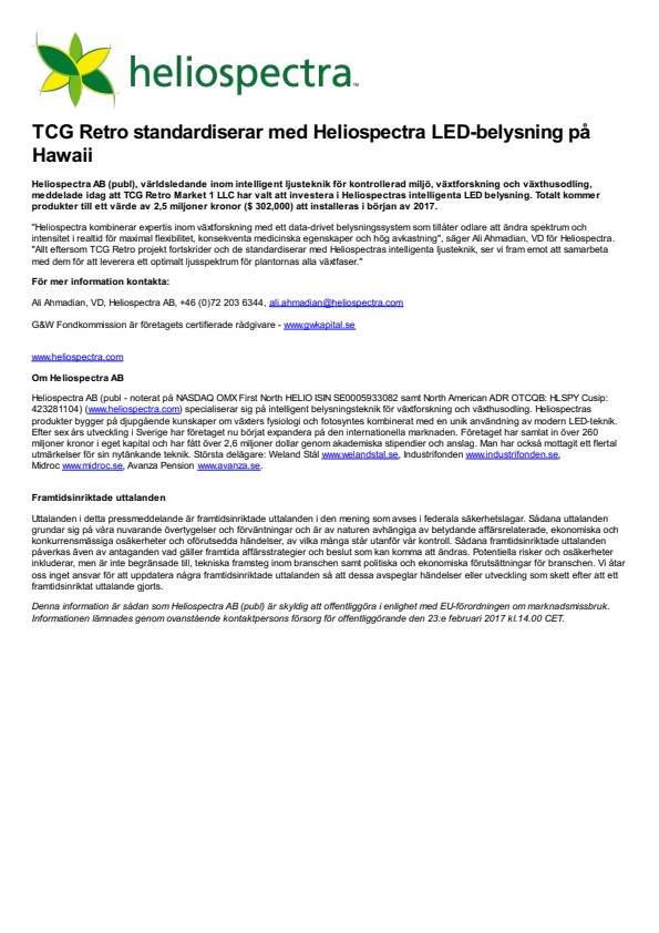 Heliospectra AB (publ), världsledande inom intelligent ljusteknik för kontrollerad miljö, växtforskning och växthusodling, meddelade idag att TCG Retro Market 1 LLC har valt att investera i Heliospectras intelligenta LED belysning. Totalt kommer produkter till ett värde av 2,5 miljoner kronor ($ 302,000) att installeras i början av 2017.
