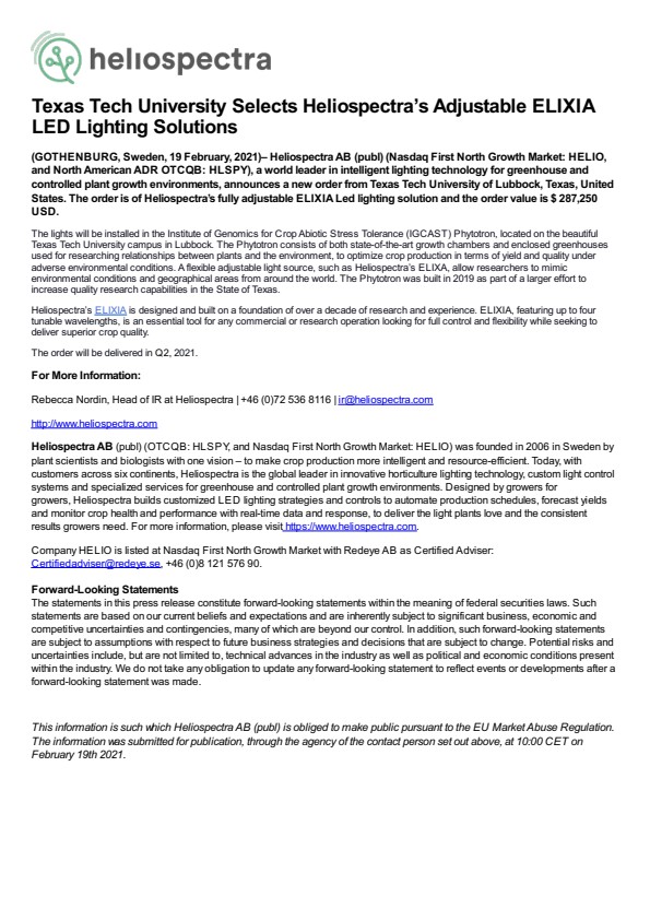The lights will be installed in the Institute of Genomics for Crop Abiotic Stress Tolerance (IGCAST) Phytotron, located on the beautiful Texas Tech University campus in Lubbock. The Phytotron consists of both state-of-the-art growth chambers and enclosed greenhouses used for researching relationships between plants and the environment, to optimize crop production in terms of yield and quality under adverse environmental conditions. A flexible adjustable light source, such as Heliospectra’s ELIXA, allow researchers to mimic environmental conditions and geographical areas from around the world. The Phytotron was built in 2019 as part of a larger effort to increase quality research capabilities in the State of Texas.