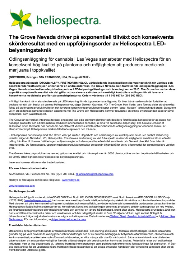 Heliospectra AB (publ) (OTCQB: HLSPY, FIRSTNORTH: HELIO), världsledande inom intelligent belysningsteknik för växthus och kontrollerade växthusmiljöer, annonserar en andra order från The Grove Nevada. Den framstående odlingsanläggningen i Las Vegas Nevada standardiserade på Heliospectras LED-belysningslösningar och teknologi redan 2015. The Grove har sedan dess uppnått exceptionella resultat när det gäller att accelerera skörden och samtidigt kontrollera odlingen för att leverera konsekventa medicinska profiler på cannabisplantorna. Ordern värderas till 1 749 667 kr (209 960 USD).