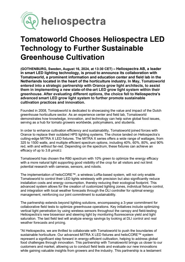“At Heliospectra, we are thrilled to collaborate with Tomatoworld to push the boundaries of sustainable horticulture. Our advanced MITRA X LED fixtures and helioCORE™ system represent a significant step forward in energy-efficient cultivation, helping to address global food challenges through innovation. This partnership with Tomatoworld brings us closer to our customers and market, allowing us to conduct field tests and evaluate our new innovations while gaining valuable insights from growers and the industry. This partnership is a testament to our shared vision for a greener future, where technology and sustainability work hand in hand to create lasting impact,” says Bonny Heeren, CEO of Heliospectra.