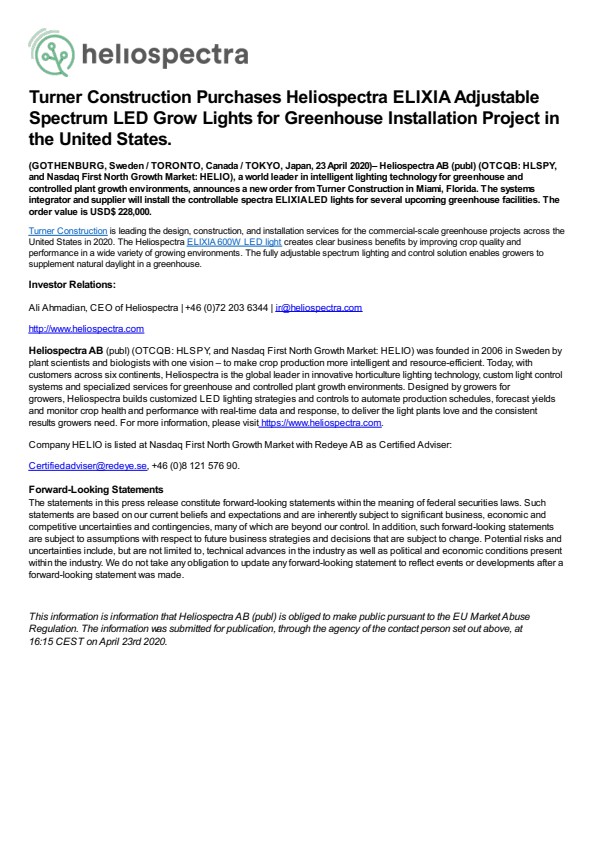 (GOTHENBURG, Sweden / TORONTO, Canada / TOKYO, Japan, 23 April 2020)– Heliospectra AB (publ) (OTCQB: HLSPY, and Nasdaq First North Growth Market: HELIO), a world leader in intelligent lighting technology for greenhouse and controlled plant growth environments, announces a new order from Turner Construction in Miami, Florida. The systems integrator and supplier will install the controllable spectra ELIXIA LED lights for several upcoming greenhouse facilities. The order value is USD$ 228,000.