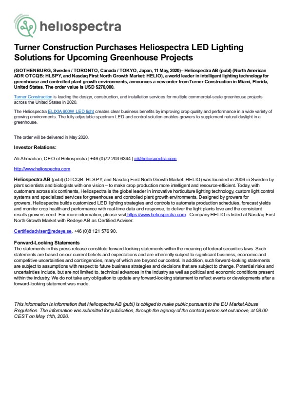 (GOTHENBURG, Sweden / TORONTO, Canada / TOKYO, Japan, 11 May, 2020)– Heliospectra AB (publ) (North American ADR OTCQB: HLSPY, and Nasdaq First North Growth Market: HELIO), a world leader in intelligent lighting technology for greenhouse and controlled plant growth environments, announces a new order from Turner Construction in Miami, Florida, United States. The order value is USD $270,000.