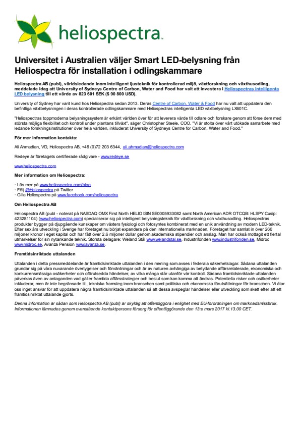 Heliospectra AB (publ), världsledande inom intelligent ljusteknik för kontrollerad miljö, växtforskning och växthusodling, meddelade idag att University of Sydneys Centre of Carbon, Water and Food har valt att investera i Heliospectras intelligenta LED belysning (https://www.heliospectra.com/led-grow-lights-applications) till ett värde av 823 601 SEK ($ 90 800 USD).