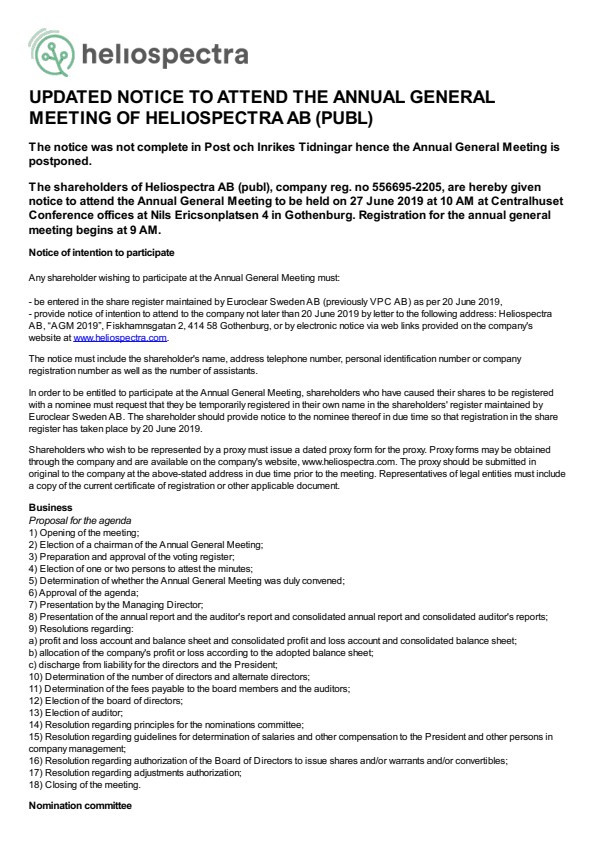 UPDATED NOTICE TO ATTEND THE ANNUAL GENERAL MEETING OF HELIOSPECTRA AB (PUBL)