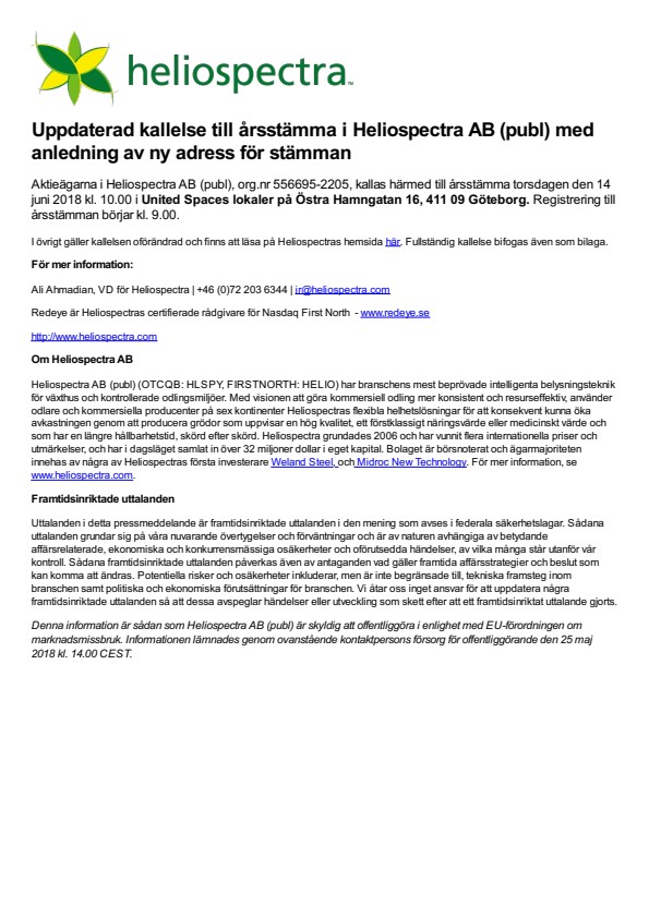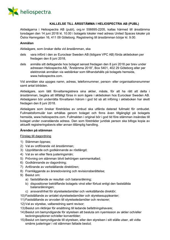 Aktieägarna i Heliospectra AB (publ), org.nr 556695-2205, kallas härmed till årsstämma torsdagen den 14 juni 2018 kl. 10.00 i United Spaces lokaler på Östra Hamngatan 16, 411 09 Göteborg. Registrering till årsstämman börjar kl. 9.00.