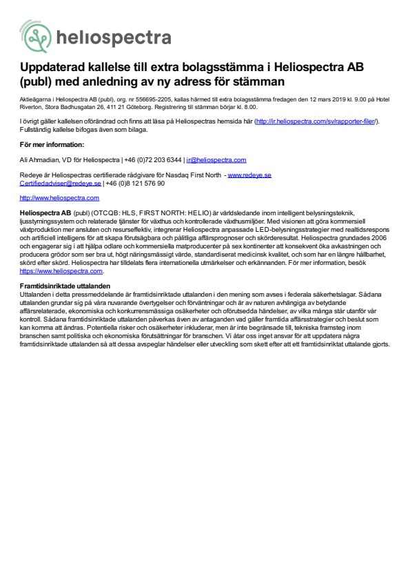 Aktieägarna i Heliospectra AB (publ), org. nr 556695-2205, kallas härmed till extra bolagsstämma fredagen den 12 mars 2019 kl. 9.00 på Hotel Riverton, Stora Badhusgatan 26, 411 21 Göteborg. Registrering till stämman börjar kl. 8.00.