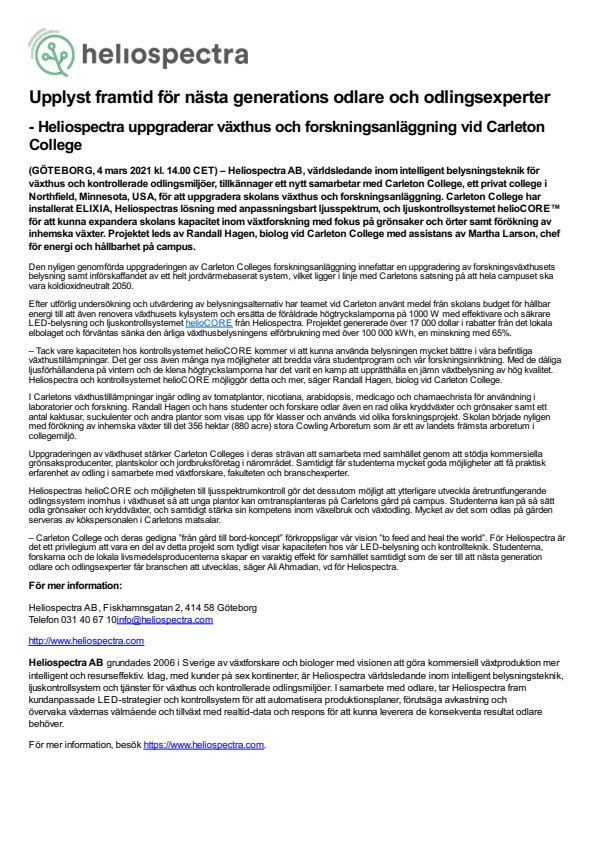 (GÖTEBORG, 4 mars 2021 kl. 14.00 CET) – Heliospectra AB, världsledande inom intelligent belysningsteknik för växthus och kontrollerade odlingsmiljöer, tillkännager ett nytt samarbetar med Carleton College, ett privat college i Northfield, Minnesota, USA, för att uppgradera skolans växthus och forskningsanläggning. Carleton College har installerat ELIXIA, Heliospectras lösning med anpassningsbart ljusspektrum, och ljuskontrollsystemet helioCORE™ för att kunna expandera skolans kapacitet inom växtforskning med fokus på grönsaker och örter samt förökning av inhemska växter. Projektet leds av Randall Hagen, biolog vid Carleton College med assistans av Martha Larson, chef för energi och hållbarhet på campus.